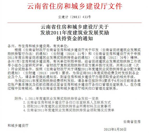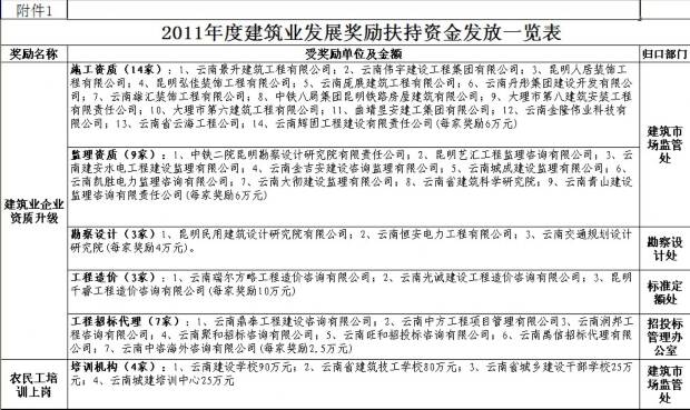 2011年度云南省促進(jìn)建筑業(yè)發(fā)展獎(jiǎng)勵(lì)
